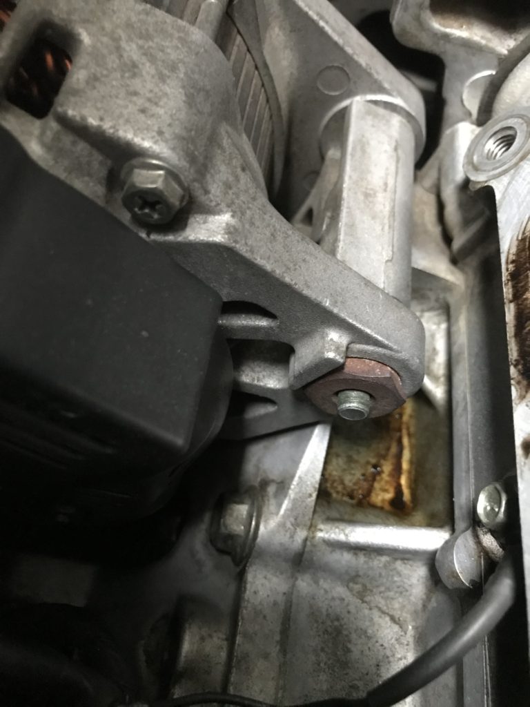 オルタネータの裏あたりのシリンダブロックの窪みに漏れたオイルが溜まっています![]()
