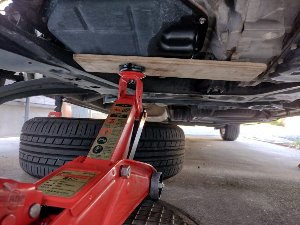 エンジン底面に木片などを挟んでジャッキで支持してから右エンジンマウントを外します。